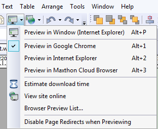 'Preview in Window' (internet Explorer) opent de pagina binnen WebPlus. Onthoud de sneltoetscombinatie 'Alt'-