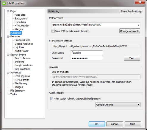 Vanuit de 'Site Properties' tab ga je naar de rubriek 'Publishing' en vandaar kun je de ftpverbinding testen.