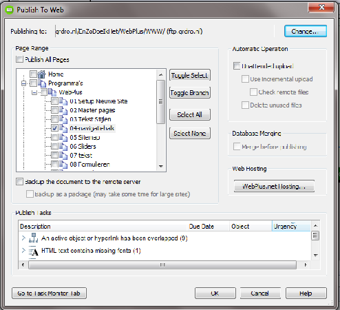 Incremental Update: Webplus gaat de aangegeven pagina's exporteren, maar bestanden die reeds op de server staan en sinds de voorgaande update onveranderd zijn gebleven, zullen niet worden geupload. Erg prettig als er met weinig aanpassingen wordt geupdate.