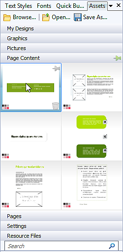 from other Asset Packs and/or by importing pictures, graphics, or PagePlus pack files. You can tag assets and then save or export your custom asset pack. (See WebPlus Help for details.)