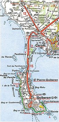 Na een goede nachtrust zijn wij naar het schiereiland Quiberon gereden. Quiberon, Bretons: Kiberen. Ligt in het zuiden van Bretagne aan de Golf van Biskaje. De baai tussen Quiberon en de vaste kust van Frankrijk heet de Baai van Quiberon. Het schiereiland Quiberon biedt een grote verscheidenheid aan landschappen, In het westen een spectaculaire ruige kust en in het oosten stranden van fijn zand. Quiberon is een bekende badplaats. Op de terugweg van het schiereiland boodschappen gedaan bij de Lidl en onderweg aan het water op een bankje nog even heerlijk van het uitzicht genoten en ons broodje opgegeten. Daarna bij Baden en Lamor–Baden nog gestopt op weg naar onze volgende overnachting, even ten zuiden van Vannes in Trinité-Surzur bij Chambres d’Hôtes Le Petit Etang waar ons Kingsize bed op ons stond te wachten. |